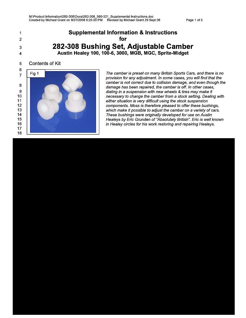 Supplied by Moss Motors (USA), part number 382-308, these camber bushes fit various British classic vehicles, e.g. Austin Healey 100, 100-6, 3000; MGB; MGC and Sprite-Midget.