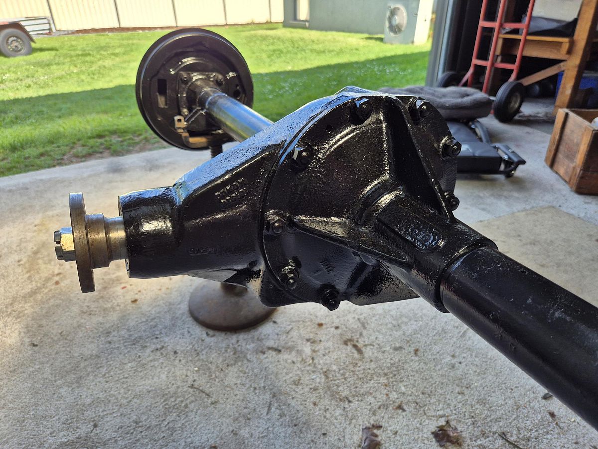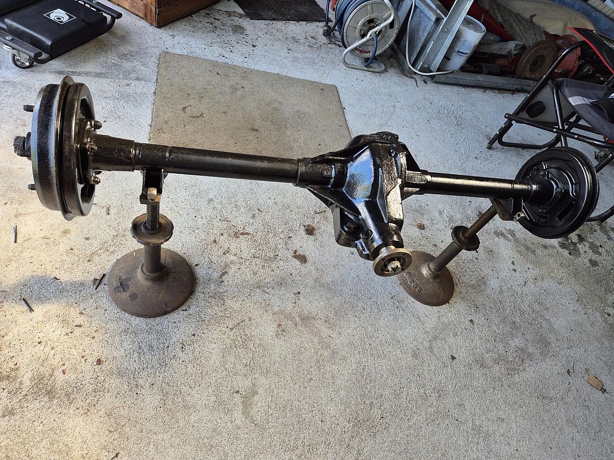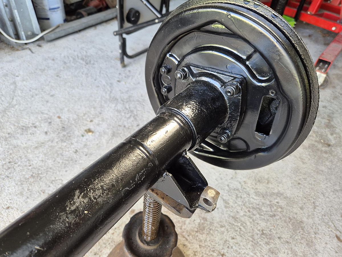 Rear axel to suit a TD/TF with 5-stud wheel hubs. Restored with new pinion oil seal. Excellent condition. Brake shoes and cyclinders not included.