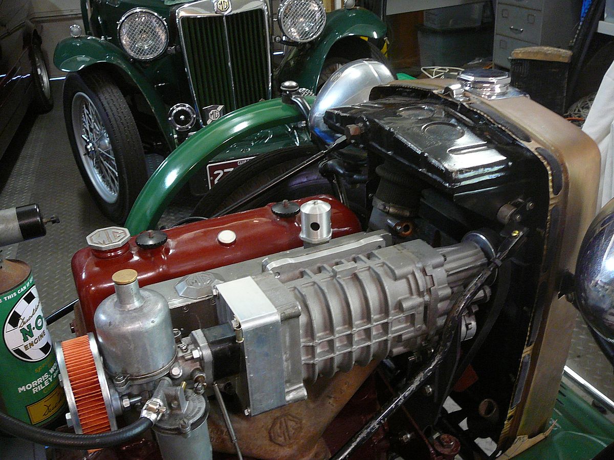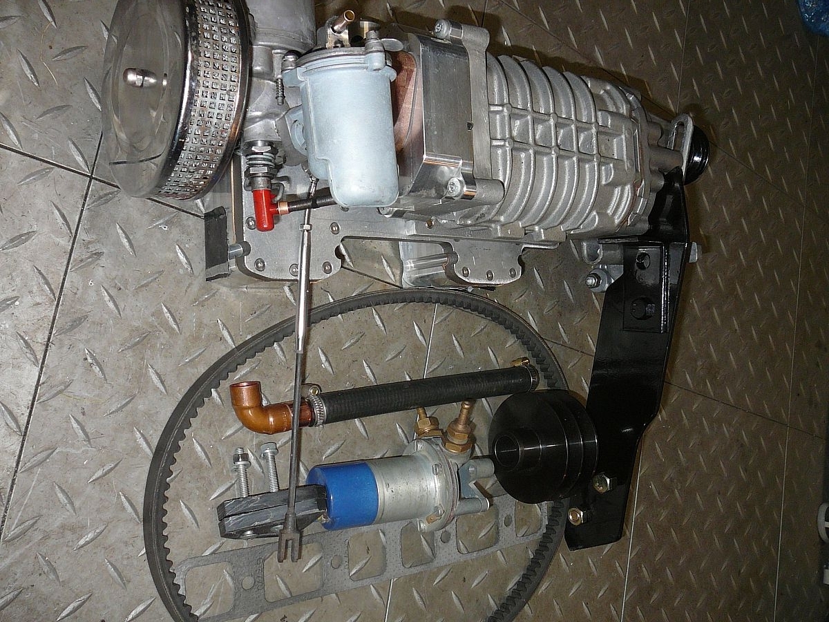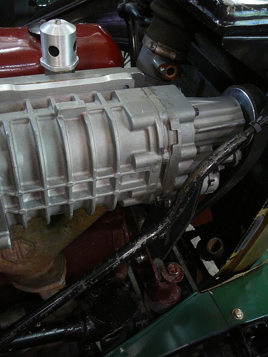 eg. on this supercharger wth the crankshaft pulley at 95mm and the supercharger pulley at 58mm and taking into account the 2 times gearing in the nose the effective ratio would be approxomately 2.8- 1 more than enough for the MG TC