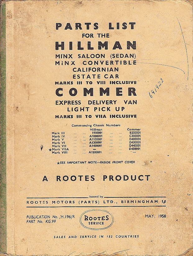 Genuine Minx parts catalog manual with exploded views for Minx Mk 3 4 5 6 7 8 Commer van/ute Mk 3 4 5 6 7 7a 3cm thick hardcover good condition