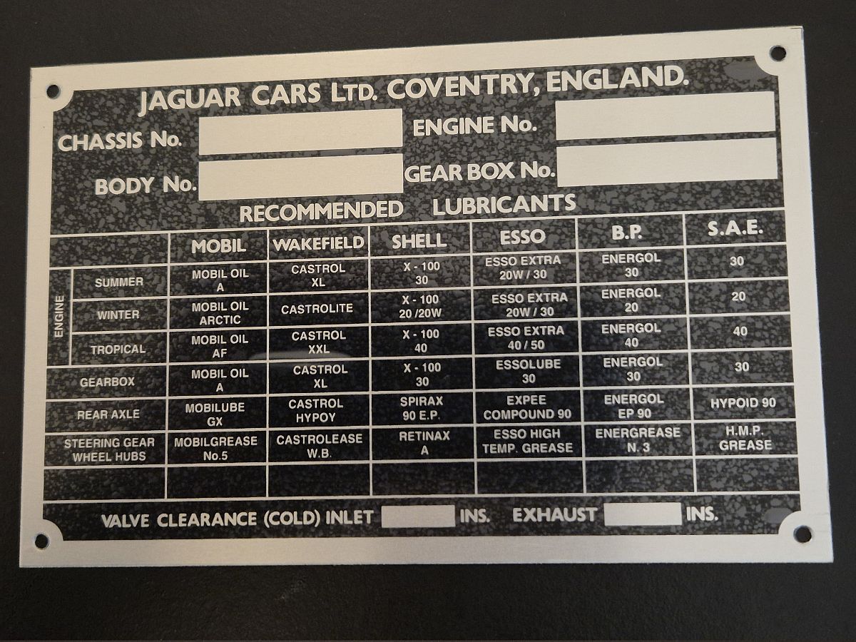 Brand New -Jaguar E-type series 1, 4.2 FHC Vehicle Data chassis plate , Early Style.