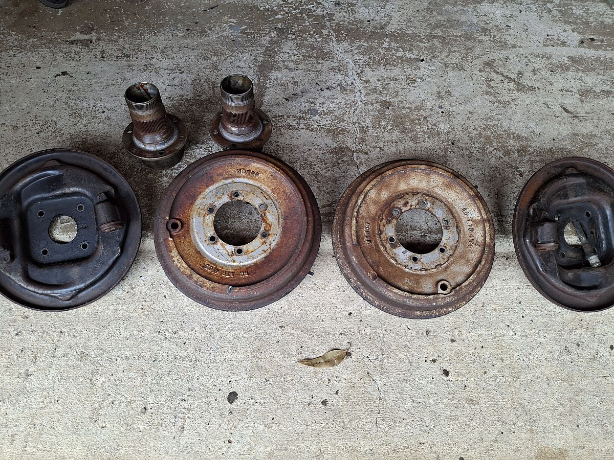 MGA 1500 Front brake backing plates, drums, and hubs.