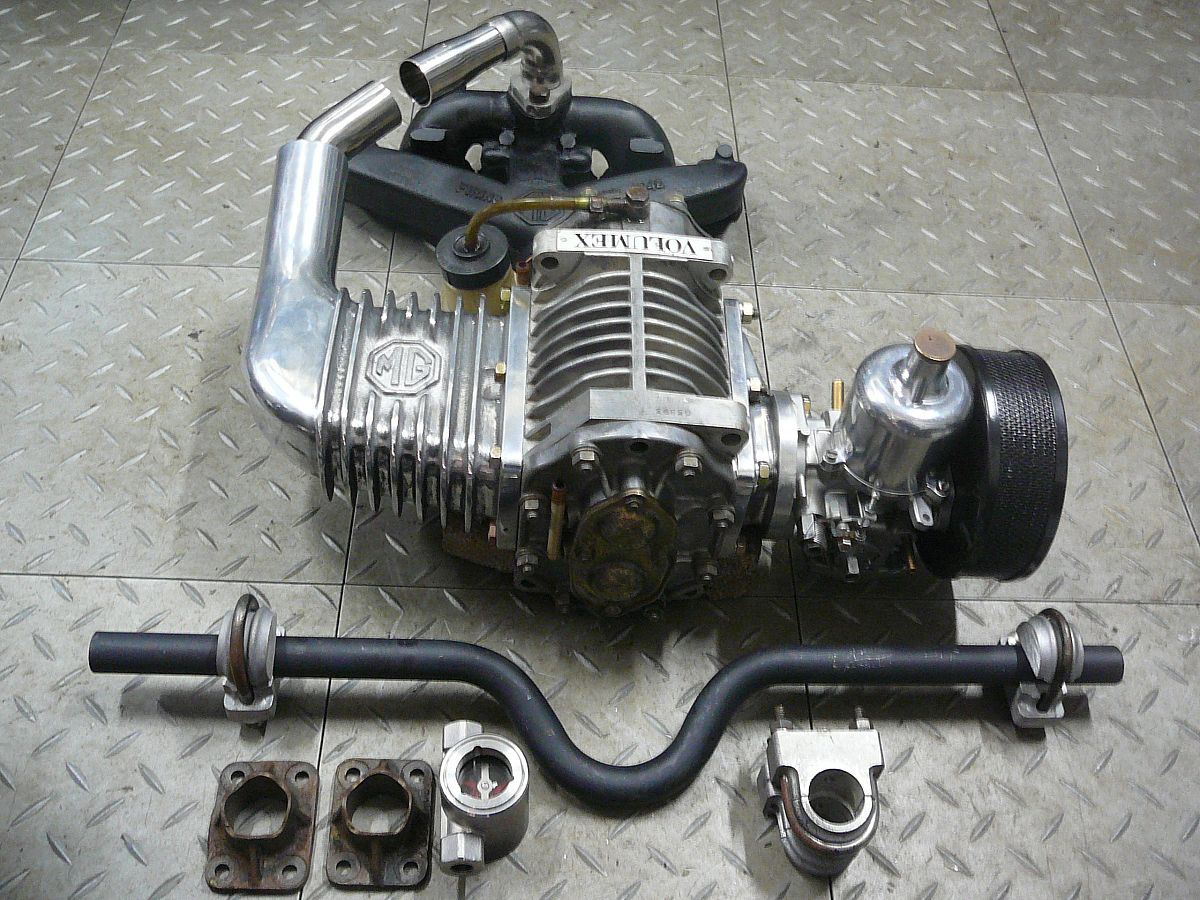 Very rare Volumex Nose Mounted Supercharger, wth aluminium castings by Vintage MG Parts in the UK to fit Prewar MG and MG TC and MG TD . or MG MMM.All expensive parts are there and are new! as is the 1 1/2 in SU carburetor. there is a rod drive to the crankshaft nose and the flat alluminium mounting plates.which are easily made as they can differ from car model to car model